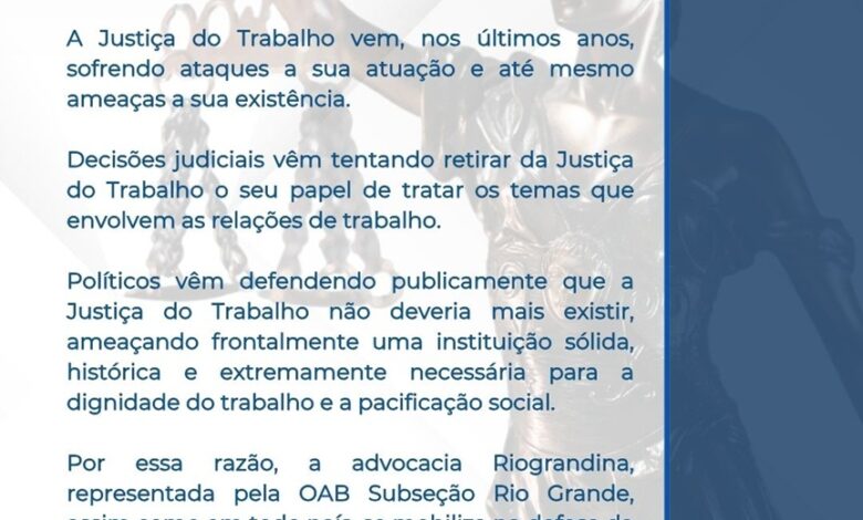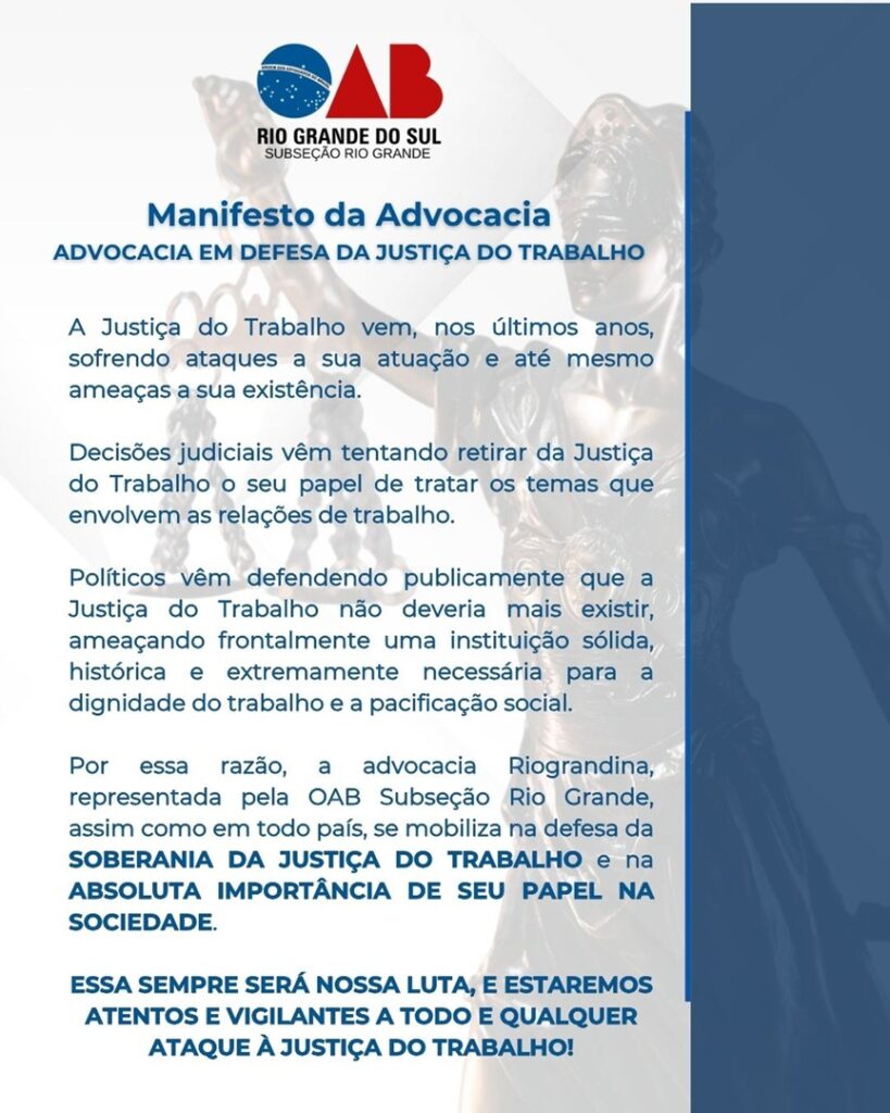 - Diante desse contexto, a OAB Rio Grande convoca a advocacia e a sociedade a se manterem atentas e vigilantes, reafirmando o compromisso com a defesa da soberania da Justiça do Trabalho e com a preservação de seu papel constitucional.